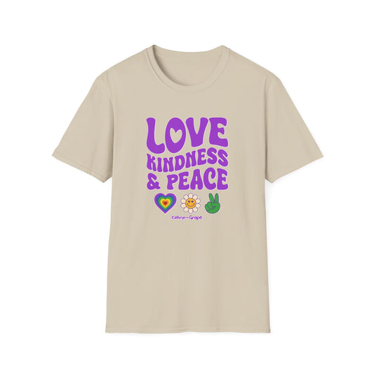 Kathryn the Grape Love, Kindness & Peace (purple text) Unisex Softstyle T-Shirt | Positive Vibes Tee