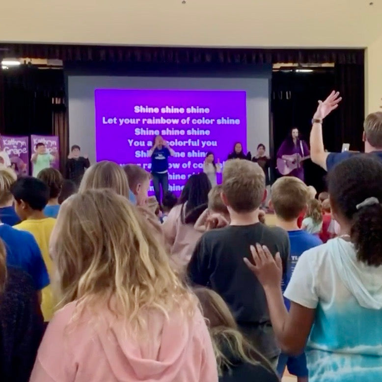 “Our school enjoyed the Kathryn the Grape assembly. It was not only engaging, but the message of treating others fairly and with respect was perfect. Students also enjoyed hearing and learning about how they too can become an author and illustrator someday. Kathryn did a great job, and the students were singing ‘Shine Shine