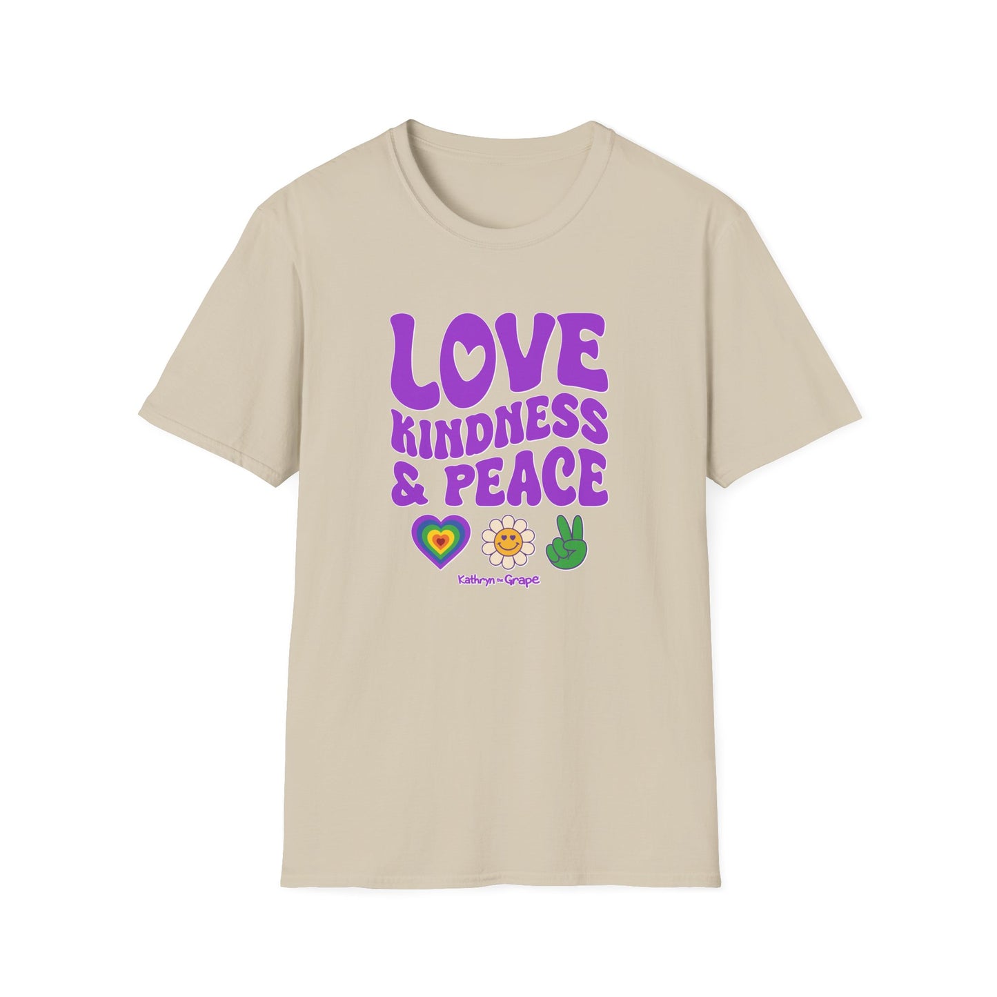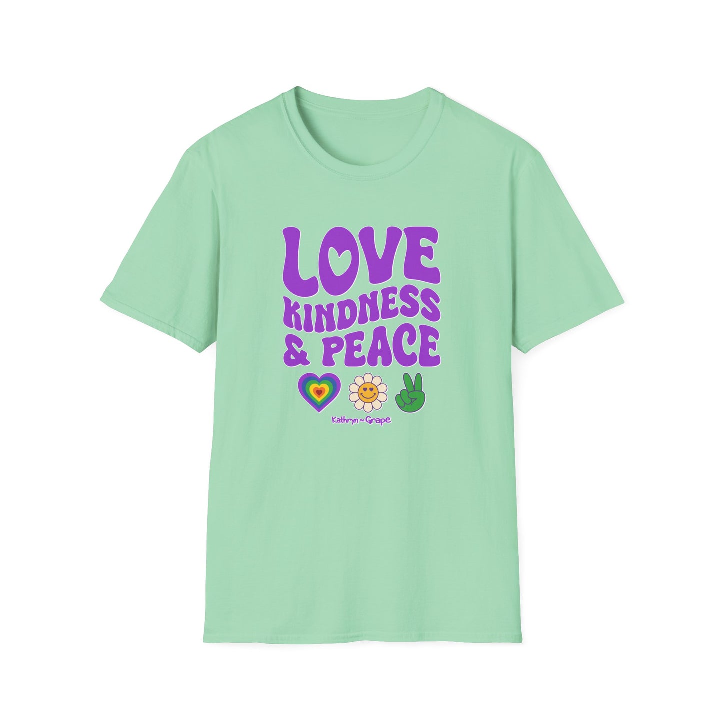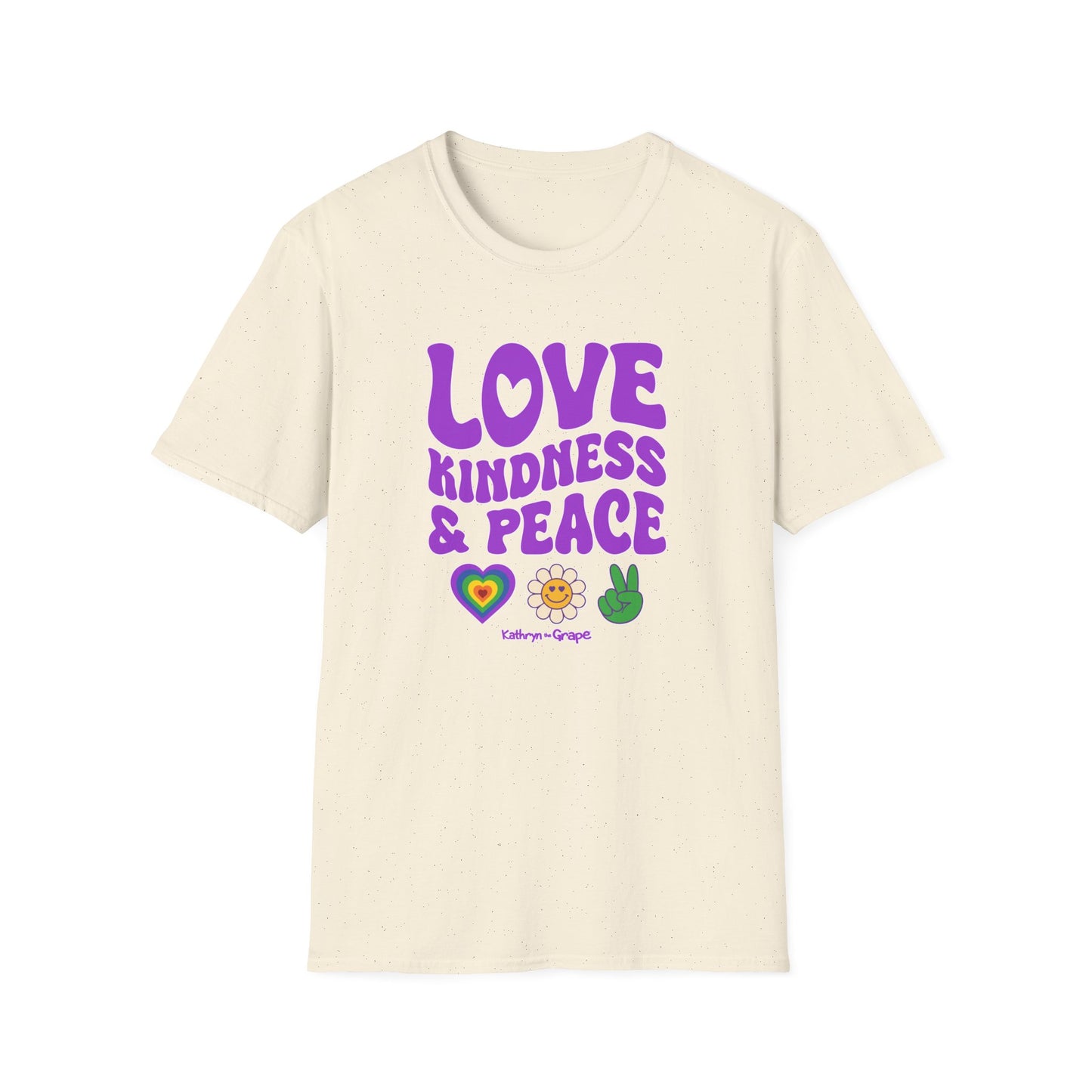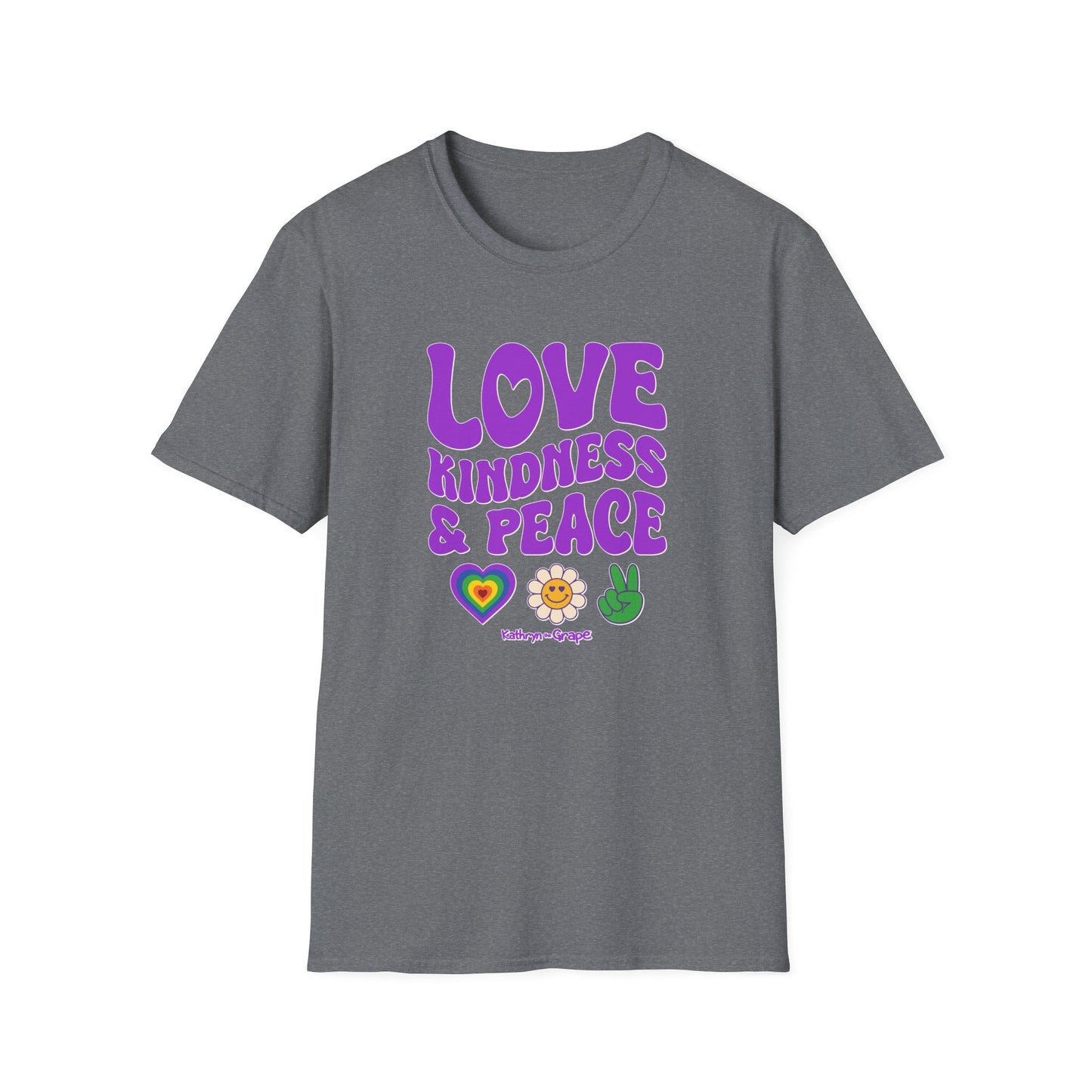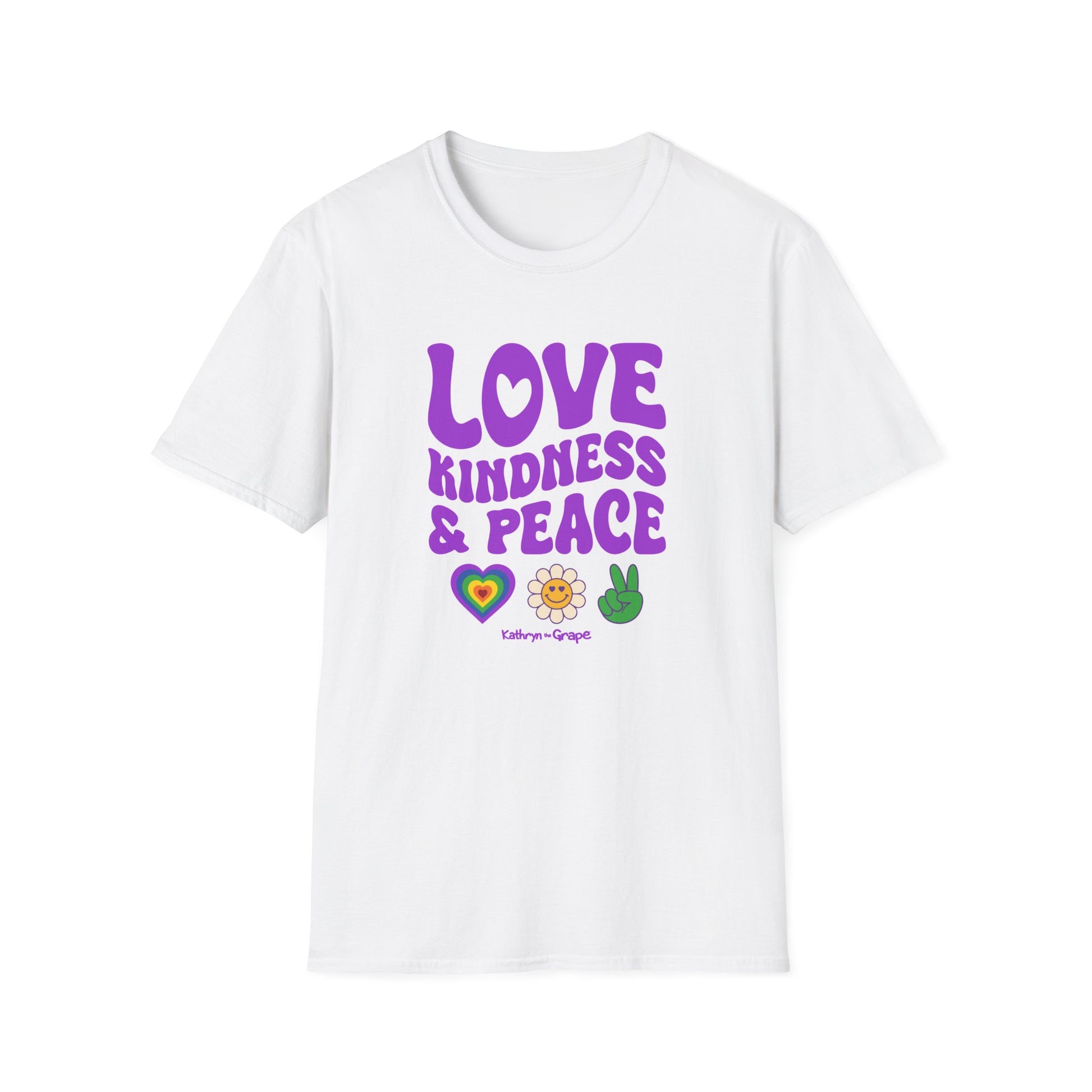 Kathryn the Grape Love, Kindness & Peace (purple text) Unisex Softstyle T-Shirt | Positive Vibes Tee