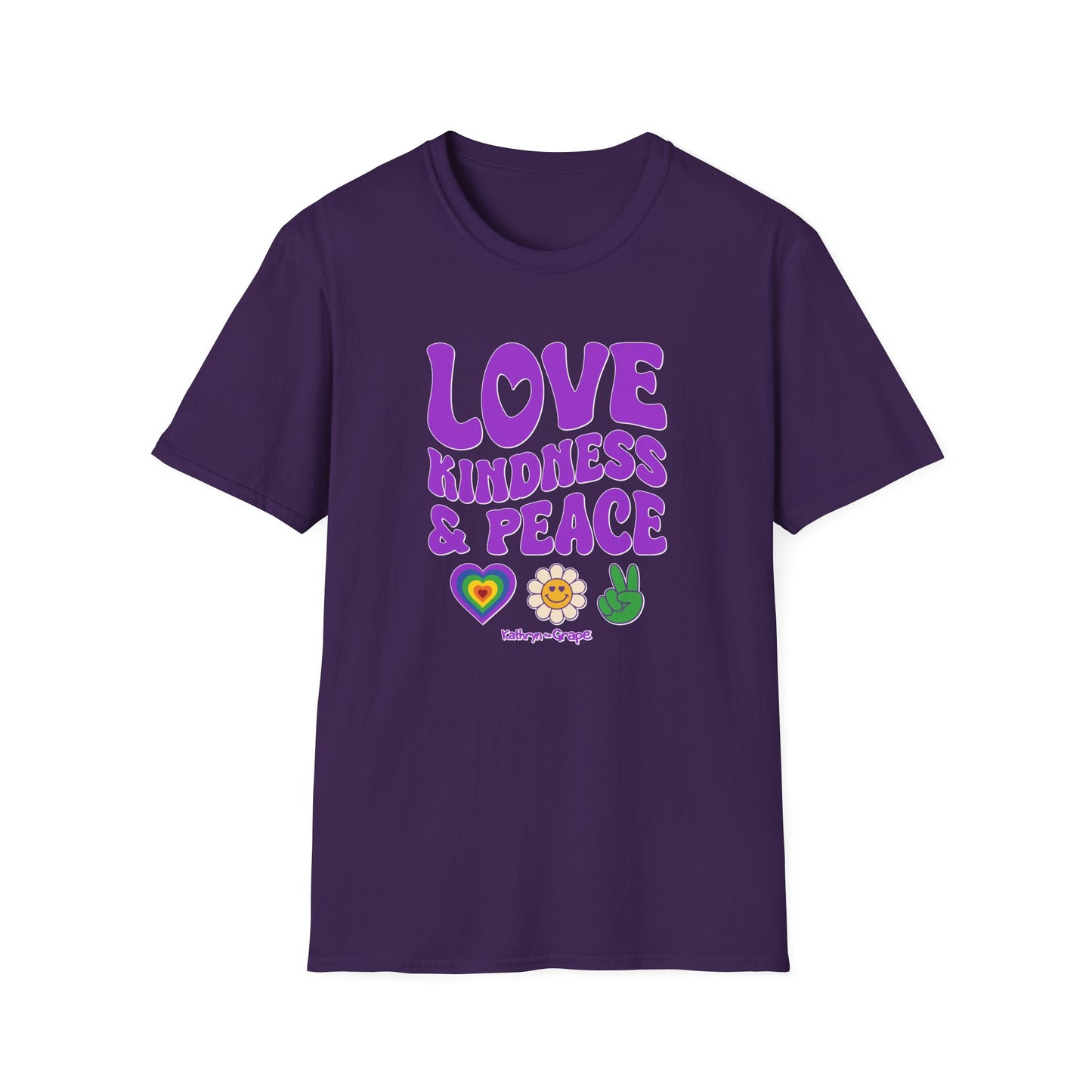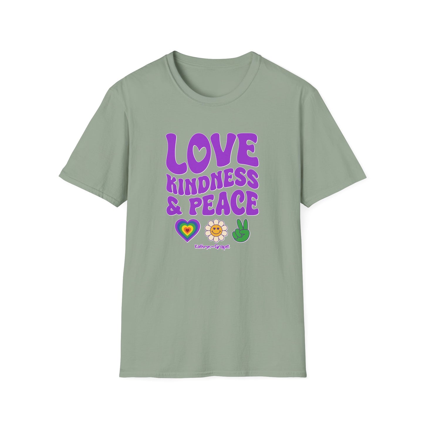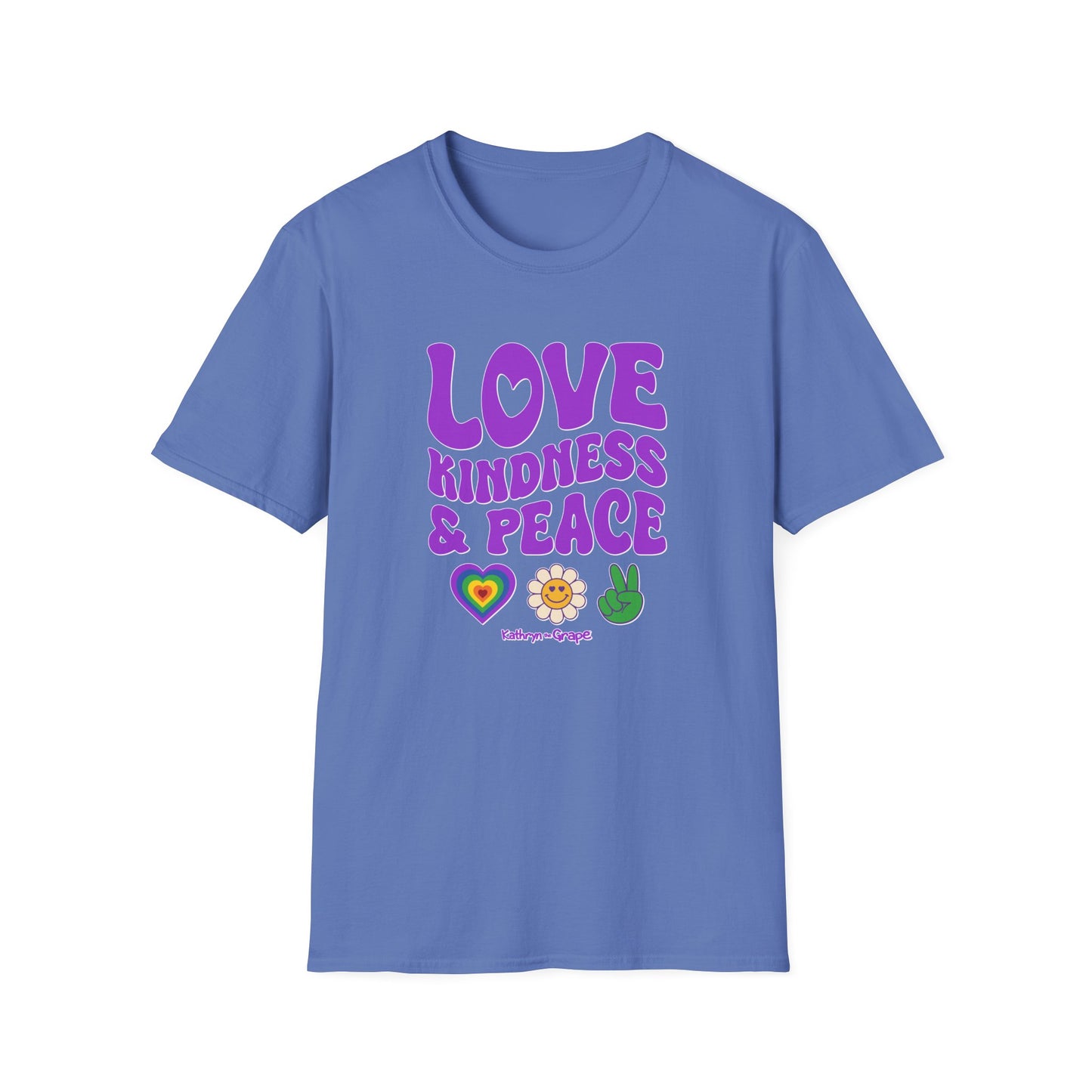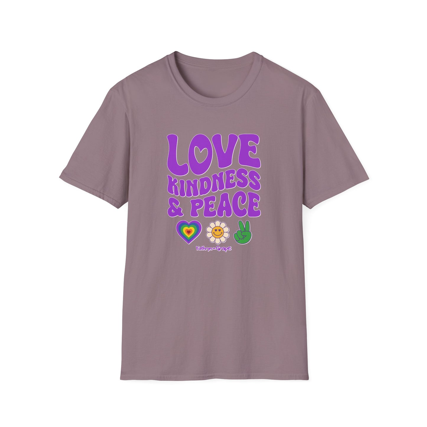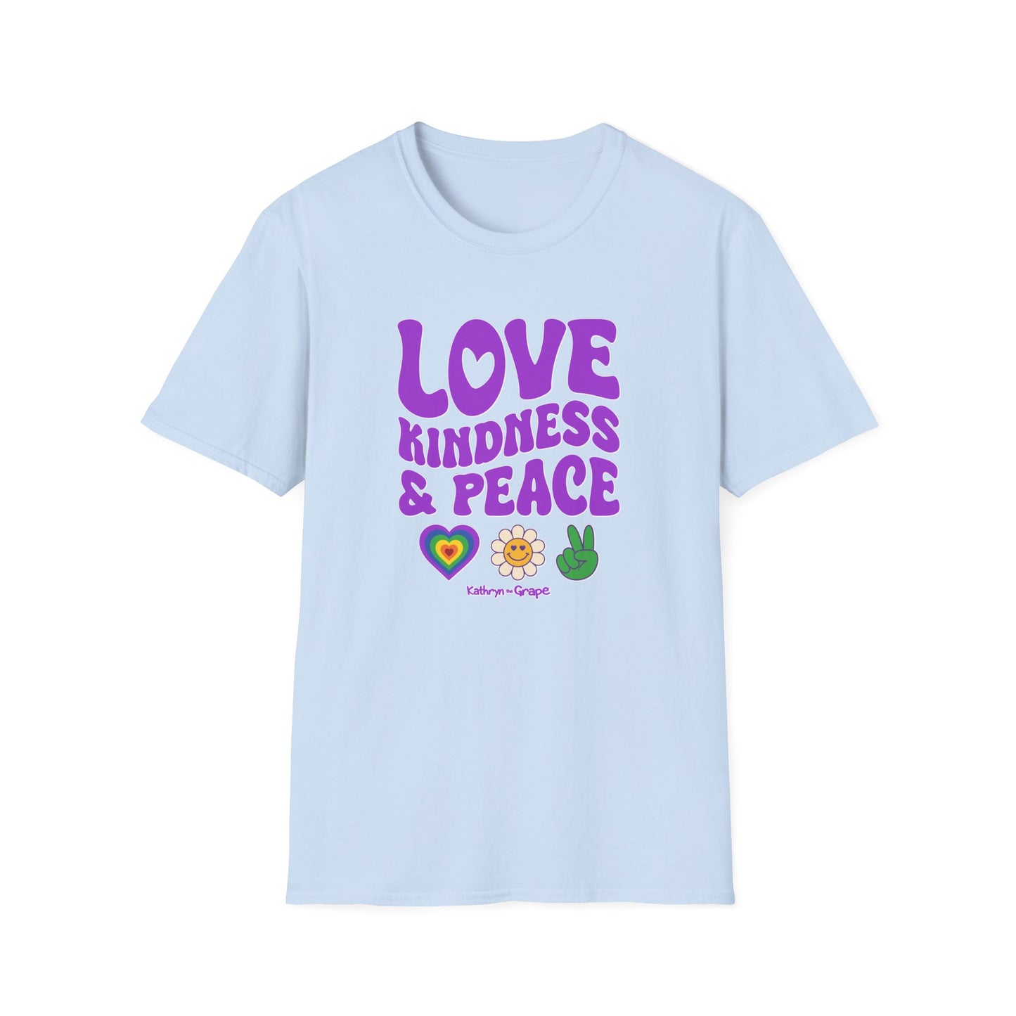 Kathryn the Grape Love, Kindness & Peace (purple text) Unisex Softstyle T-Shirt | Positive Vibes Tee